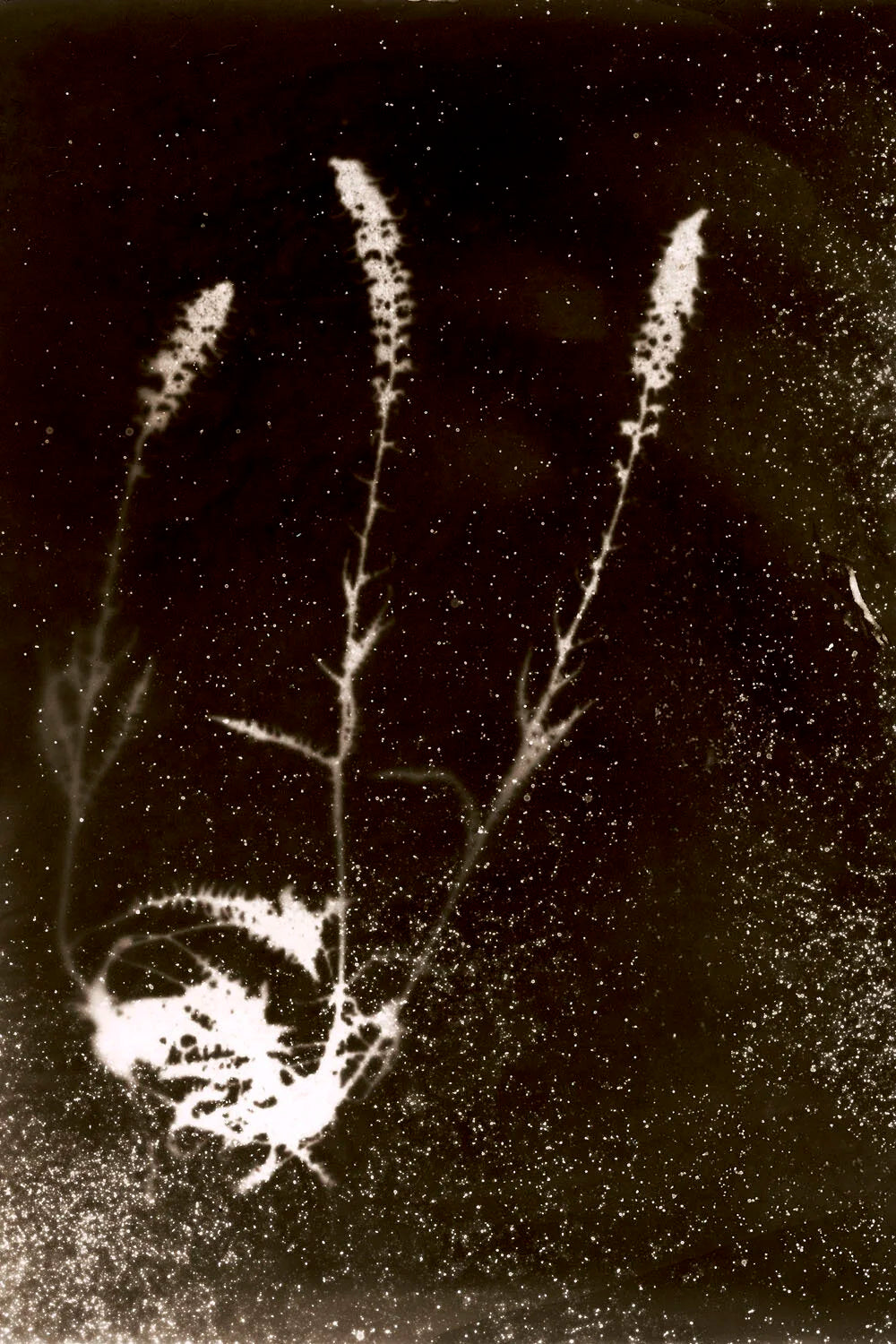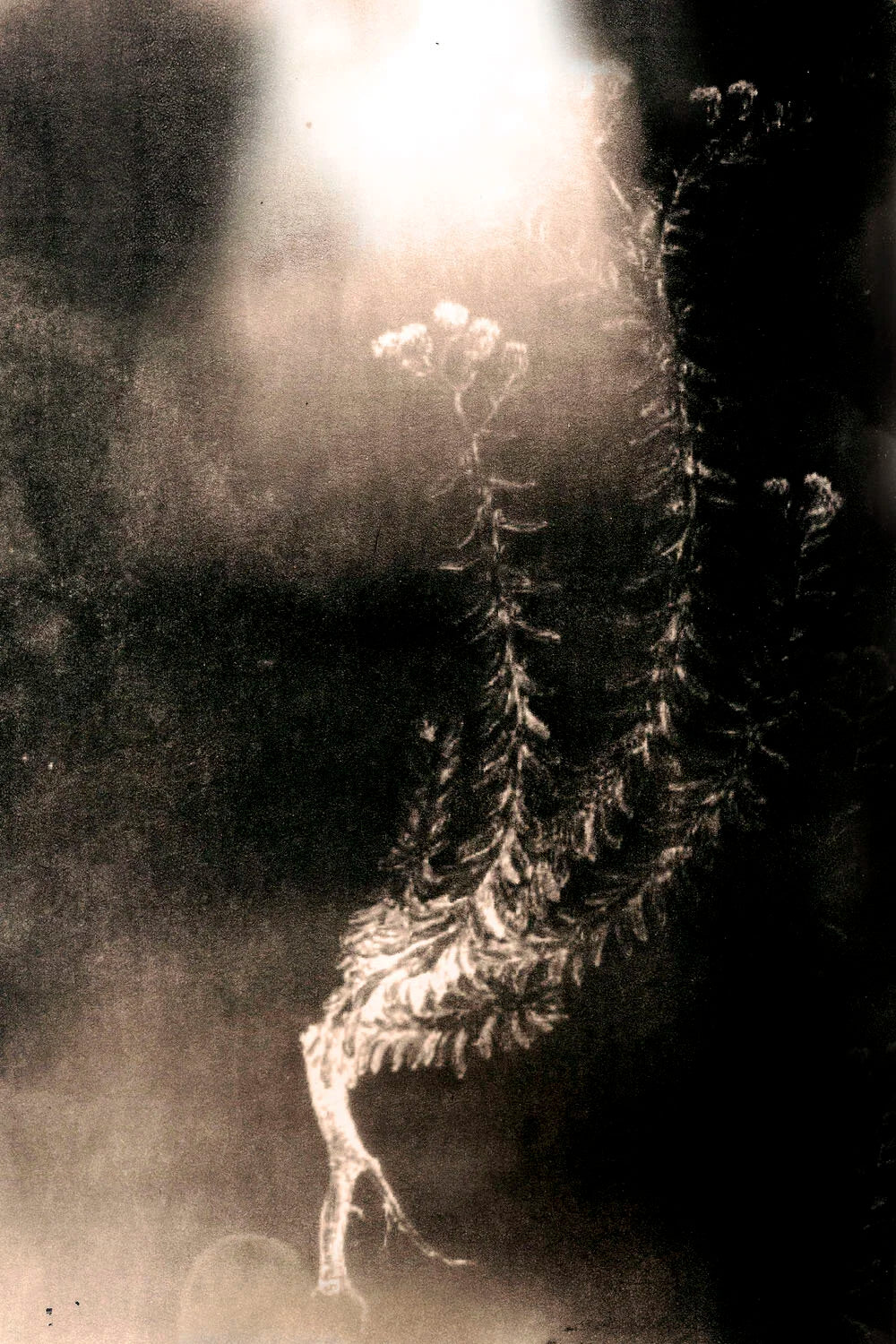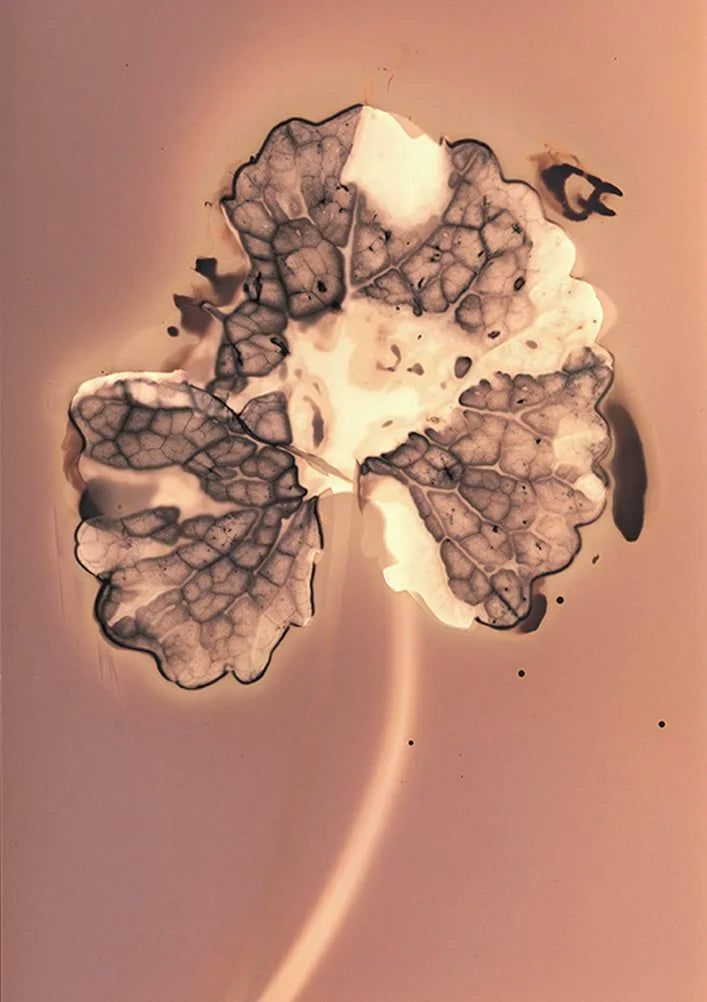 Ce dialogue avec le végétal se poursuit en 2023 avec sa série Fleurs de feux, dans la continuité de Tchernobyl Herbarium, mais en changeant de tonalité. Elle s’intéresse cette fois aux plantes rudérales, poussant sur les terres brûlées du Vésuve. Soumises à la toxicité de leur sol, elles surproduisent une molécule, le phénol, qui, au contact d’un support sensibilisé et de la lumière, devient image. Comme dans la série précédente, Anaïs Tondeur crée à partir de la destruction-même et laisse surgir ce qui d’ordinaire nous échappe. Ces formes sombres, presque calligraphiques, deviennent une poésie née des ruines. On reconnaît la nervure d’une feuille, la dentelure d’une tige, et pourtant tout se brouille dans un halo incertain, comme si la pollution elle-même contaminait la lisibilité. L’image oscille entre présence et effacement, comme si ce qu’elle nous montrait était déjà en train de disparaître.