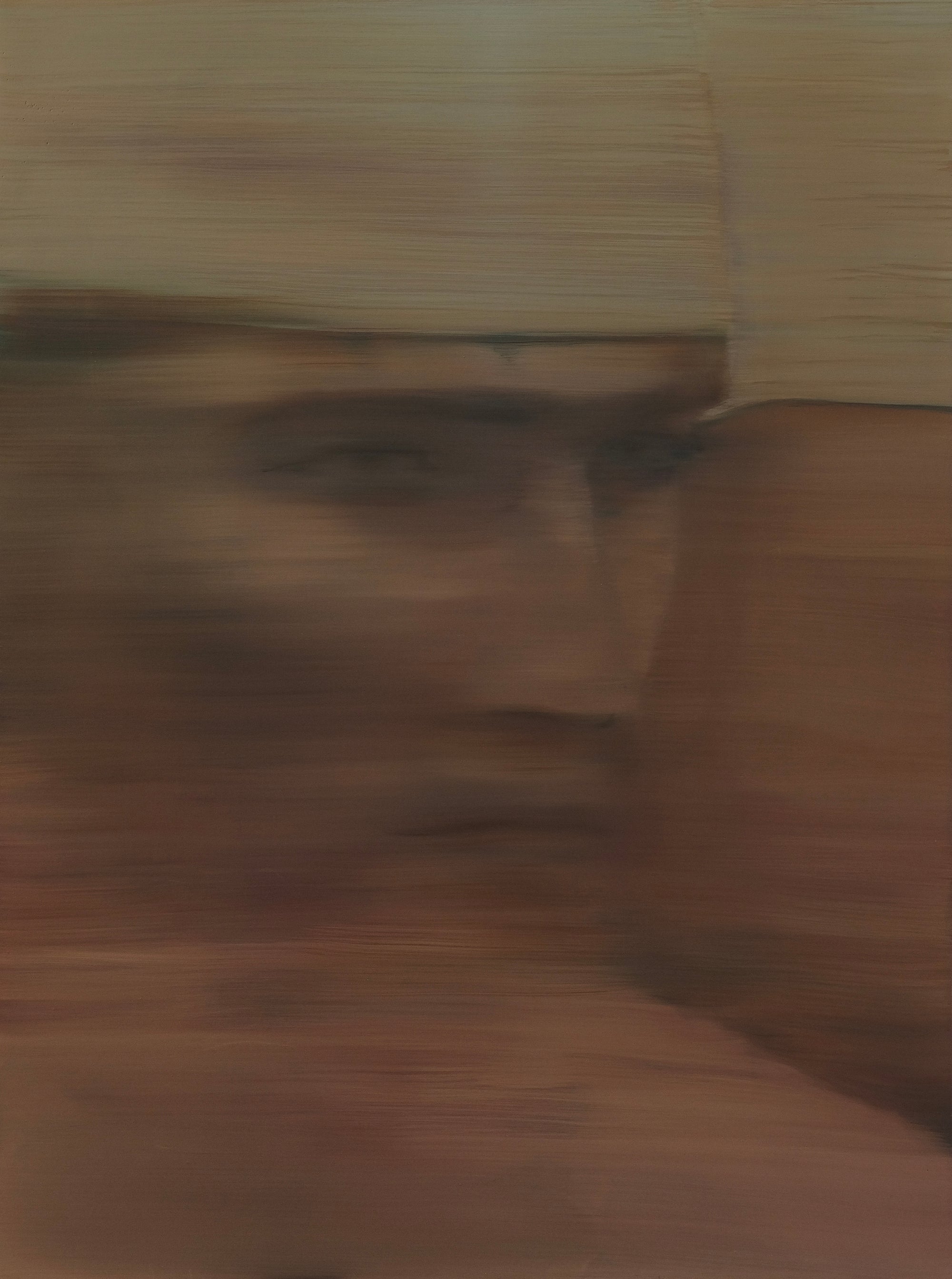 « Je me retrouve maintenant face à une brume, un écran de fumée, un nuage dans un nuancier de beiges. J’ai le sentiment que l’on cherche à me perdre, à brouiller les pistes, que l’on me cache quelque chose. Pourtant, derrière ce flou, je distingue paradoxalement nettement un visage. C’est comme si j’avais fermé les paupières pour l’imaginer, ou que je cherchais à me le remémorer à partir d’un rêve ou d’un souvenir. Le visage peint est celui d’un homme, à l’allure sévère et militaire, dont j'ignore l'identité. Le regard, peut-être inquiet, est fuyant et porté sur autre chose ; malgré cela, il attire mon attention. »